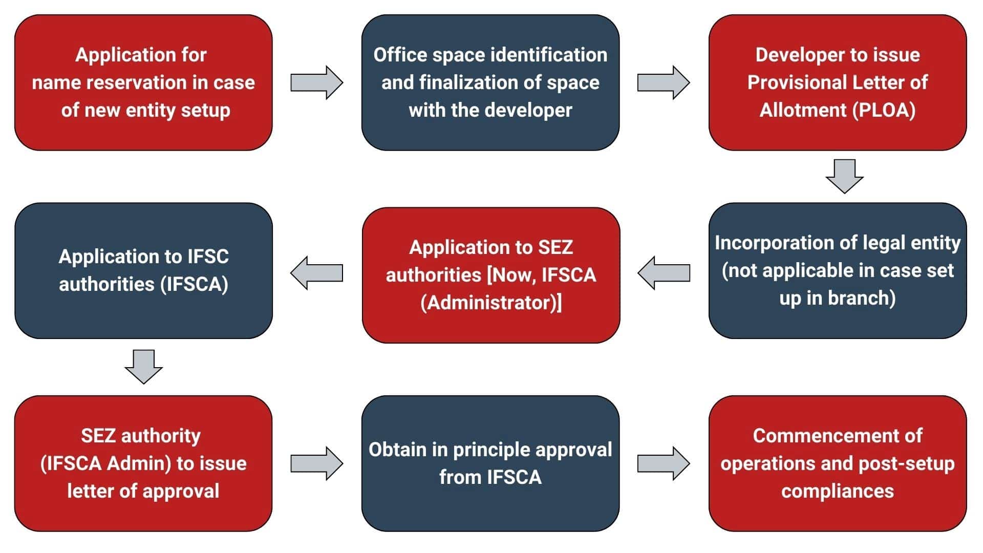 For setting up businesses at GIFT City, the first and foremost step is to identify and select the office space within the SEZ. To validate this step, approval must be taken from the developer or co-developer. The office space will serve as the location for establishing business operations.