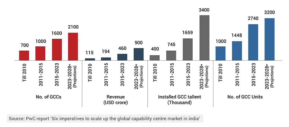 Over 150 multinationals have set up their GCCs in India in the last couple of years. According to a PwC report, by 2028 India will have 2100 GCCs, with a market size of USD 90 billion.
