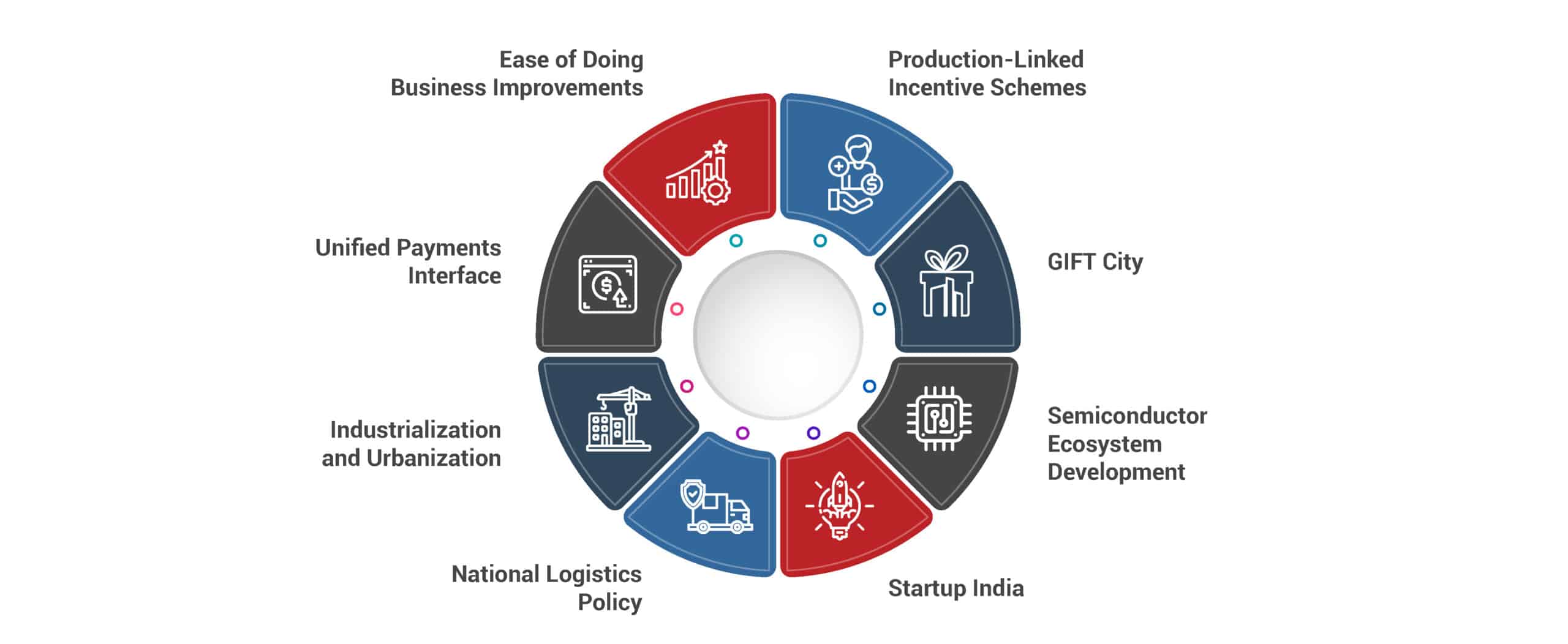 With an allocation of INR 1.97 trillion (approx. US$ 23.3 billion) for 14 production-linked sectors, the PLI program has attracted 12.50 trillion in investments and 9,50,000 jobs with Exports surpassing INR 4 trillion driven by sectors such as electronics, pharmaceuticals, and food processing. - GIFT City: