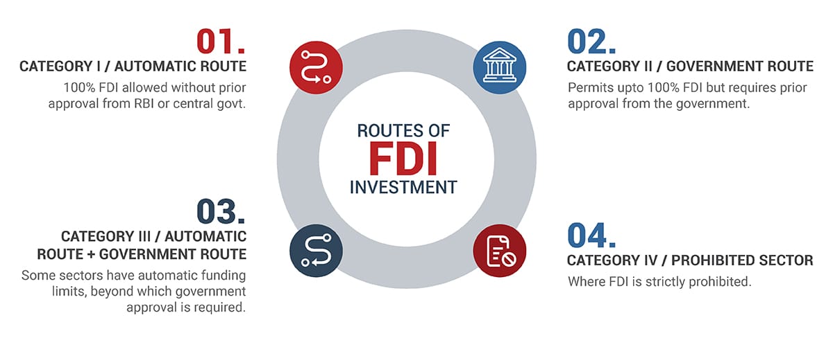 - FDI is not allowed in Prohibited Sectors like aviation, financial services, private security, etc.