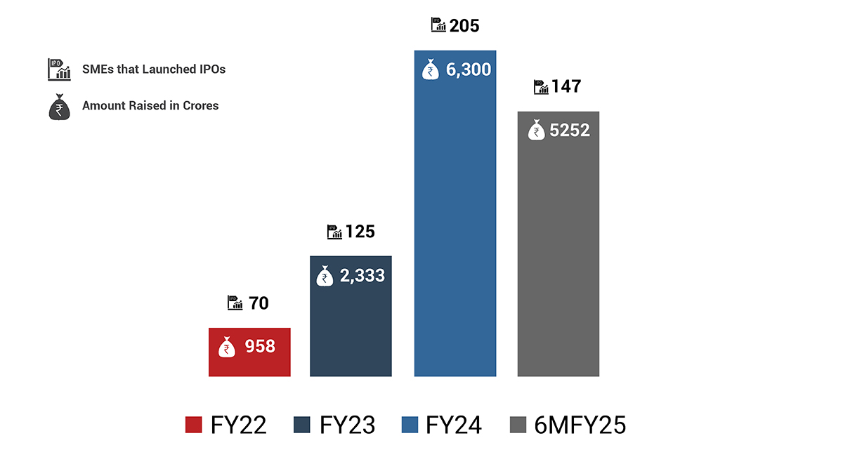 SME IPOs have seen the highest boom in the last two years. Approximately 150 SMEs got listed in the first half of 2024-25 with capital rising close to ~INR 5,000 Crores. With a growing number of SMEs going into IPOs, regulatory compliance has been catching up at a pace.