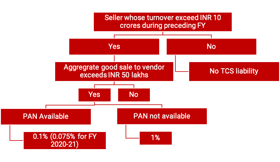 - Every seller who has received any amount as consideration on sale of any other goods above INR 50 lakhs are liable to collect an additional 0.1% of the bill amount, collect PAN and pay/deposit such amount as TCS every month.